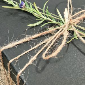 Kartonska kutija sa poklopcem, unutrašnje punjenje – drvena slamica, ukrasni natur papir. Satenska vrpca.